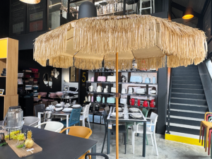 À l’entrée, une zone « fin de collection » accueille en ce moment une sélection de mobilier terrasse, idéal en cette saison. Le message de Stéphane et Claire est simple : ce que vous avez admiré dans un palace ou dans un restaurant gastronomique, vous pouvez l’avoir chez vous, et souvent pour moins cher qu’on ne l’imagine.